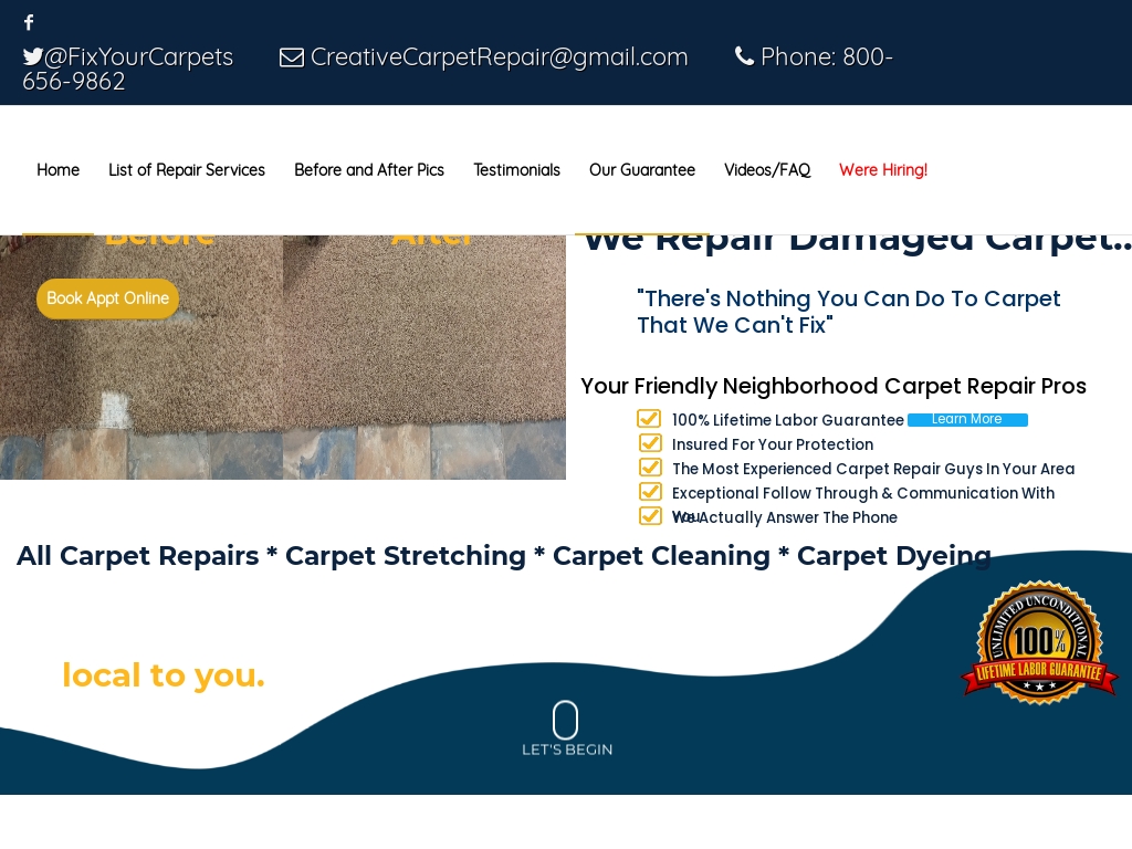 Stretching, patching, berber carpet, pet damaged carpet. Welcome to creative carpet repair! When you hire the nation's largest carpet repair company, you. Always test for color fastness in an inconspicuous place before trying any of these techniques. Carpet seam repairs and any other type of carpet repair is our specialty!