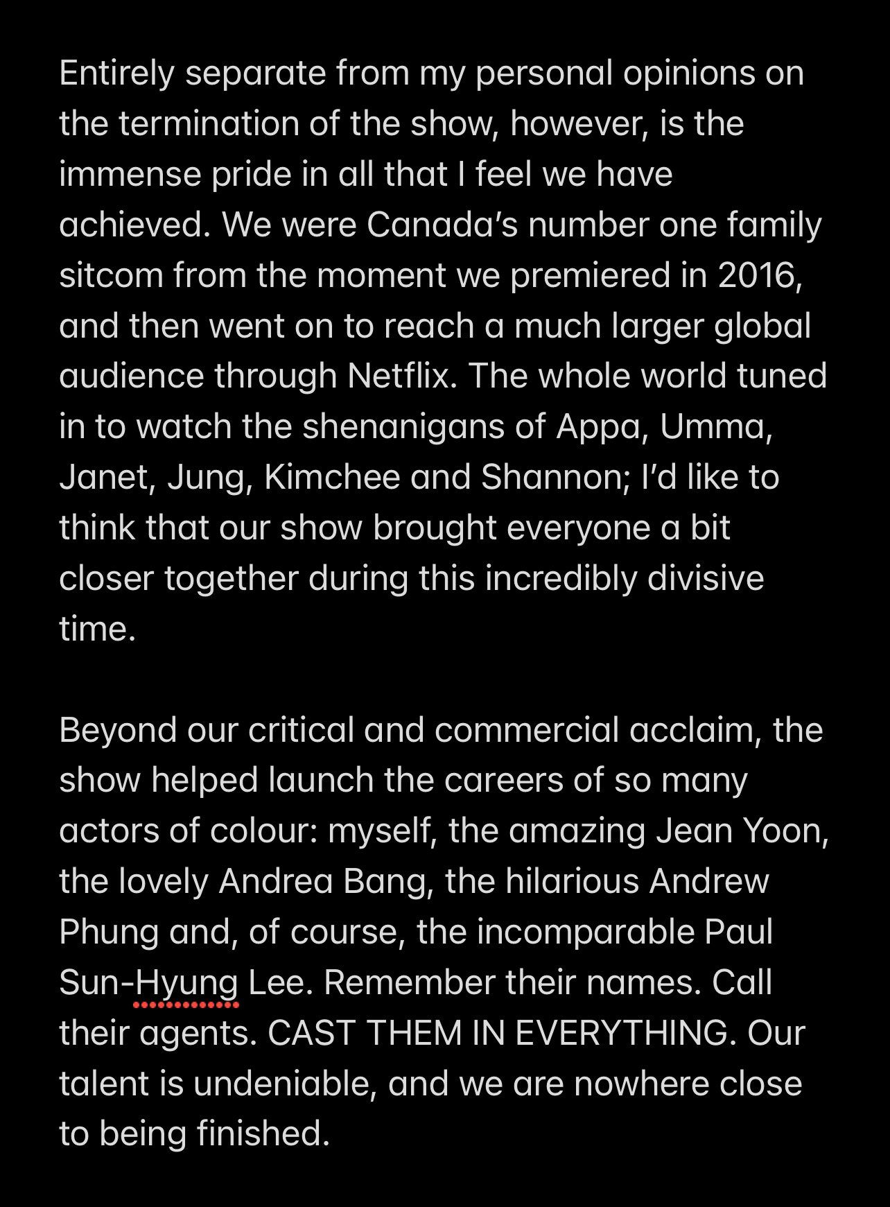 The actor, who played jung on the cbc/netflix comedy, spoke out in a lengthy simu liu. The show based on the korean canadian kim family premiered in 2016 and went on to become a huge hit.